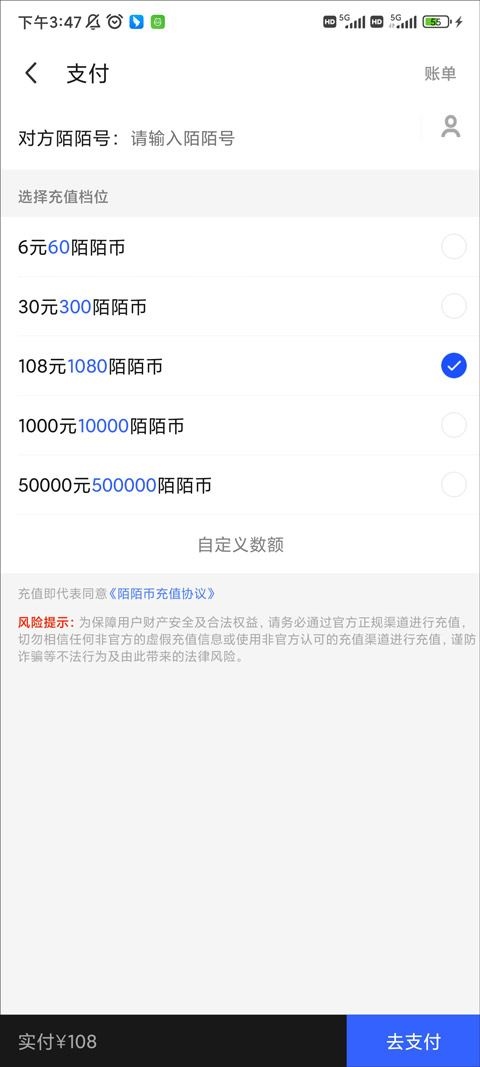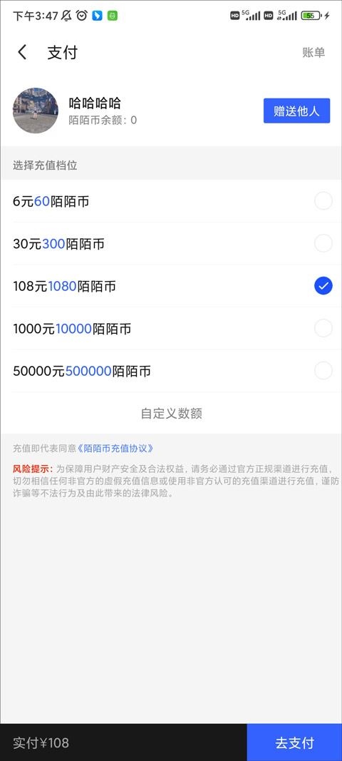 4、在充值页面,点击蓝色的“赠送他人”按钮,即可给他人充值陌陌币。