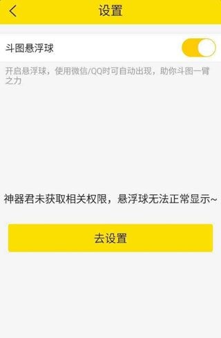 1、打开APP后,可以设置斗图悬浮球。开启后,使用微信或QQ时,悬浮球会自动出现,助你轻松斗图。如果手机没有权限,请先去设置。