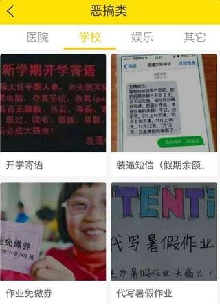 3、进入恶搞页面,选择“医院”、“学校”、“娱乐”等分类。医院的捐精单和死亡证明这些内容不适合开玩笑,建议选择学校类别的内容。