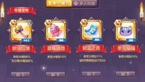 1、第一种宝物搭配方式:妙法红绦,草莓甜筒,碧蓝之音,冬雪猫猫。这套搭配主要依靠第一个宝物的满级属性飞天玄女,帮助玩家跑出高分。